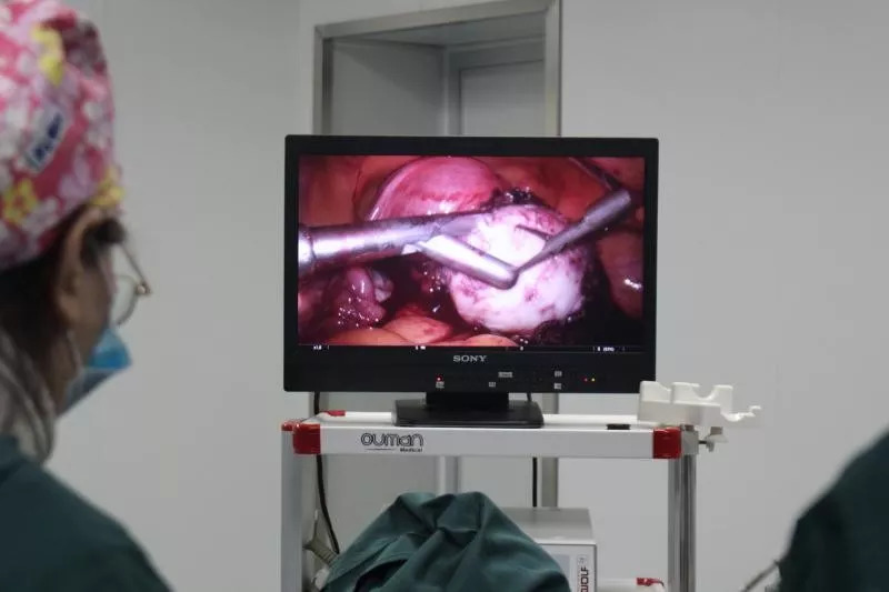 术中,汤教授在刘大姐的肚脐部位打开了3个3-5毫米的“钥匙孔”式小孔,无需开腹即可在电脑屏幕前直接清楚地观察患者宫腔内情况,施行精确地手术操作,成功将病灶从患者体内剔除。